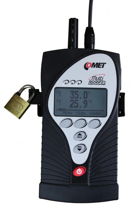 Robuste, abschließbare Halterung zur Wandmontage des Multiloggers, die das Gerät vor Diebstahl schützt. Vorhängeschloss und 3 Schlüssel sind im Lieferumfang enthalten.