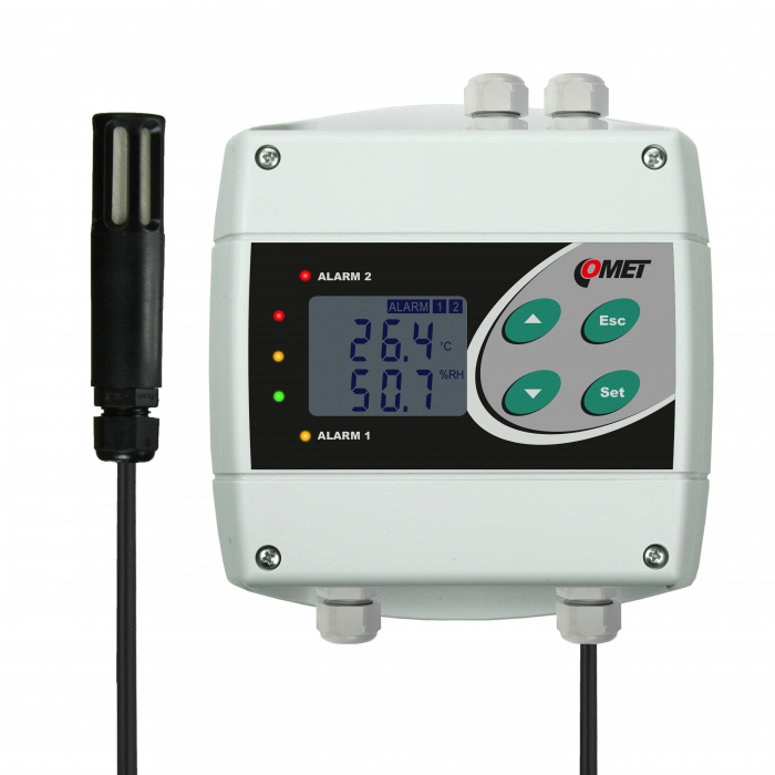 Relative Luftfeuchtigkeit, Temperatursonde an einem Kabel. Gemessene Werte werden auch in andere Feuchtigkeitsinterpretationen umgerechnet: Taupunkttemperatur, absolute Luftfeuchtigkeit, spezifische Luftfeuchtigkeit, Mischungsverhältnis, spezifische Enthalpie.