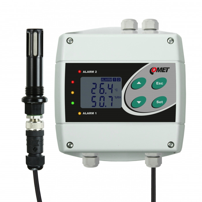 Relative Luftfeuchtigkeit, Temperatursonde an einem Kabel. Die gemessenen Werte werden auch in andere Feuchtigkeitsinterpretationen umgerechnet: Taupunkttemperatur, absolute Luftfeuchtigkeit, spezifische Luftfeuchtigkeit, Mischungsverhältnis, spezifische Enthalpie.