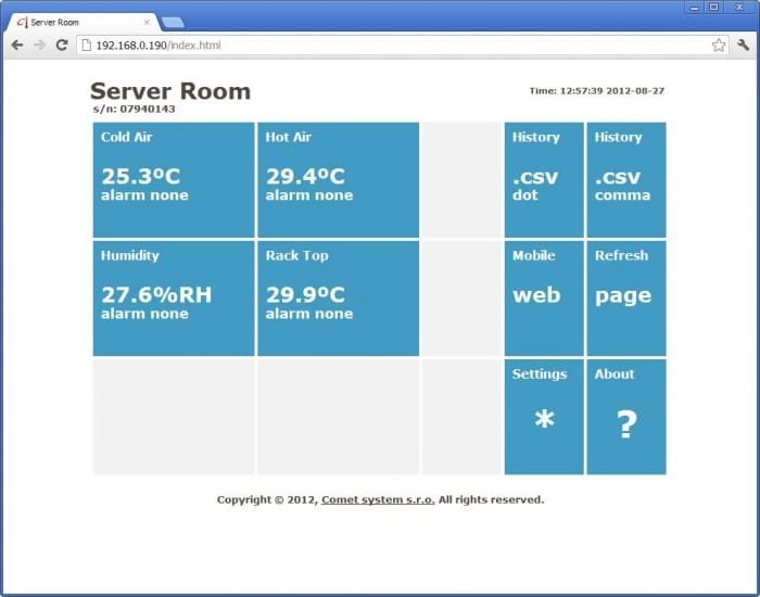 Vier-Kanal-P-Line-Websensor. Temperatur- und Feuchtigkeits- sowie Temperatursonden werden unterstützt. Fernalarm.