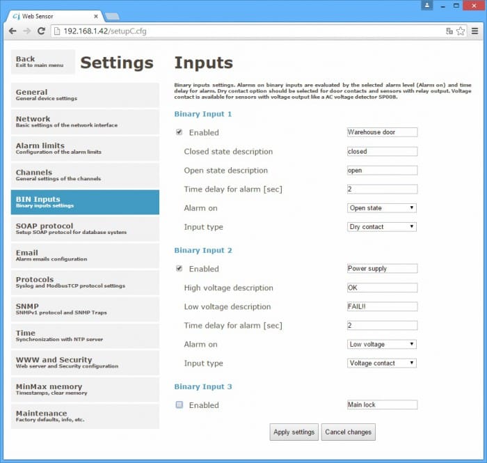Das Gerät ist mit zwei Anschlüssen für den Anschluss externer Temperatur- und Feuchtigkeitssonden sowie drei Binäreingängen für Zwei-Zustands-Signale ausgestattet. An den Binäreingang kann ein Trockenkontakt oder ein Zwei-Zustands-Spannungssignal angeschlossen werden.