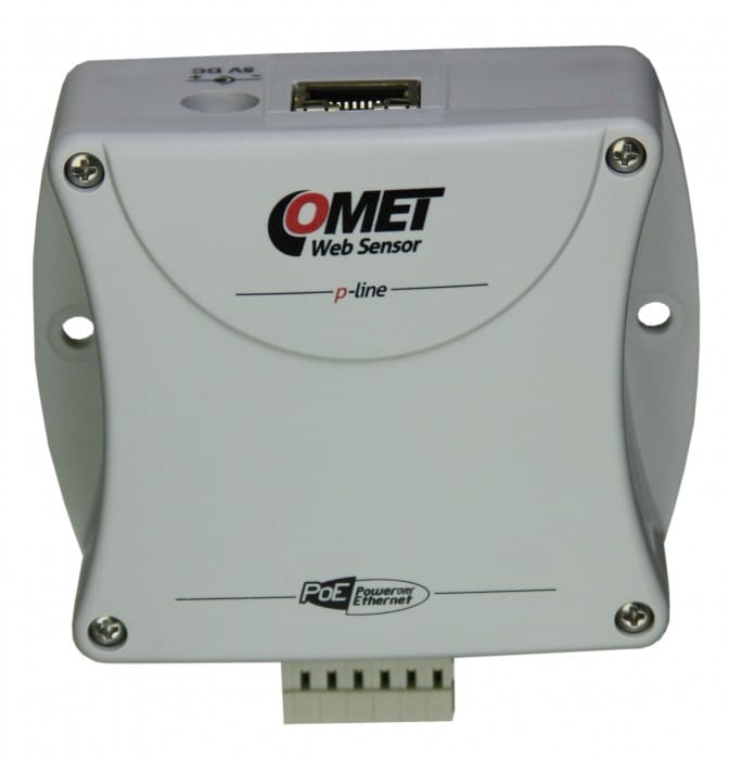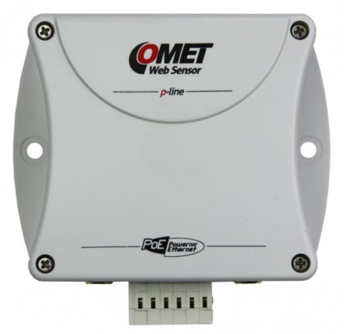 Messfühler der P-Linie mit PoE (Power over Ethernet) zur Messung von Temperatur, relativer Luftfeuchtigkeit und drei Binäreingängen für Zweizustandssignale. Fernalarm.
