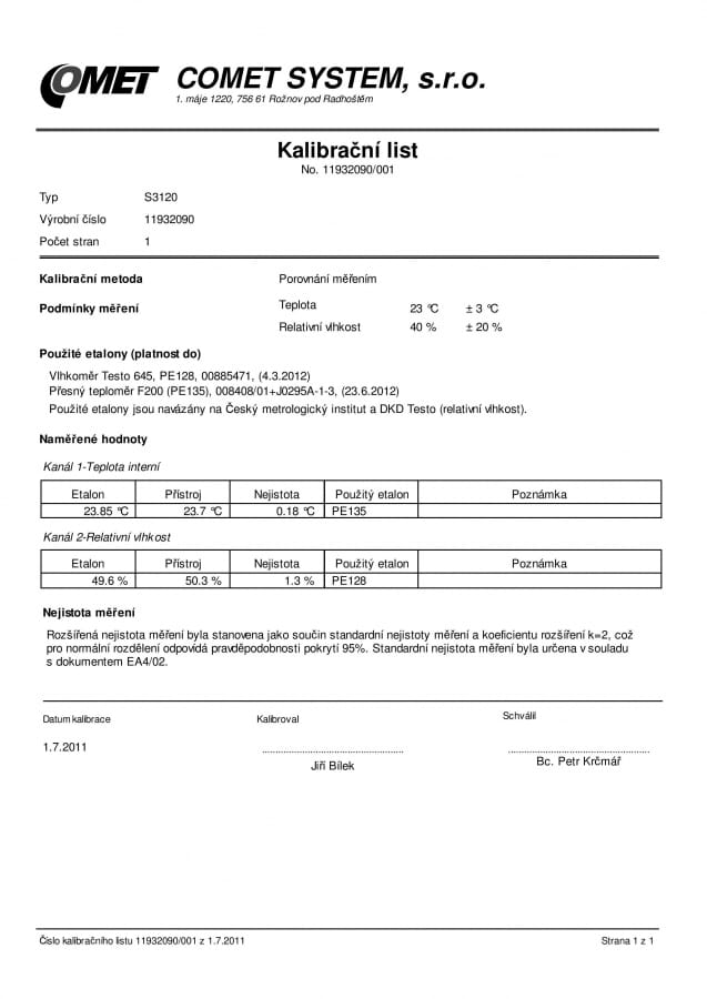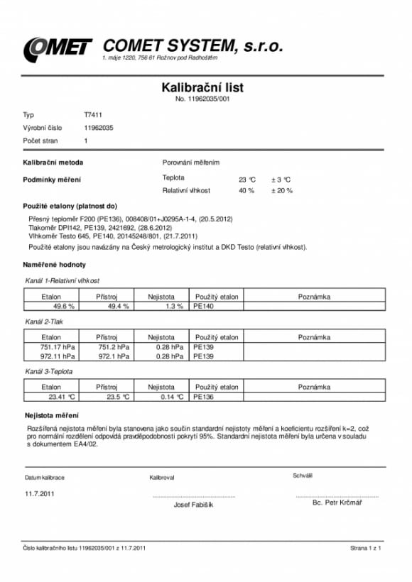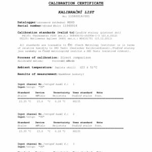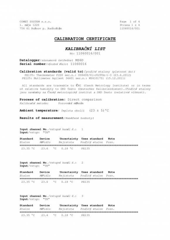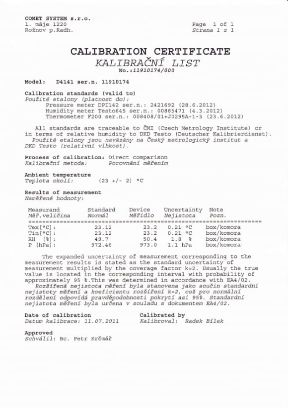 COMET products include traceable calibration certificates from COMET System, s.r.o. Calibration certificate is included in price of the product.